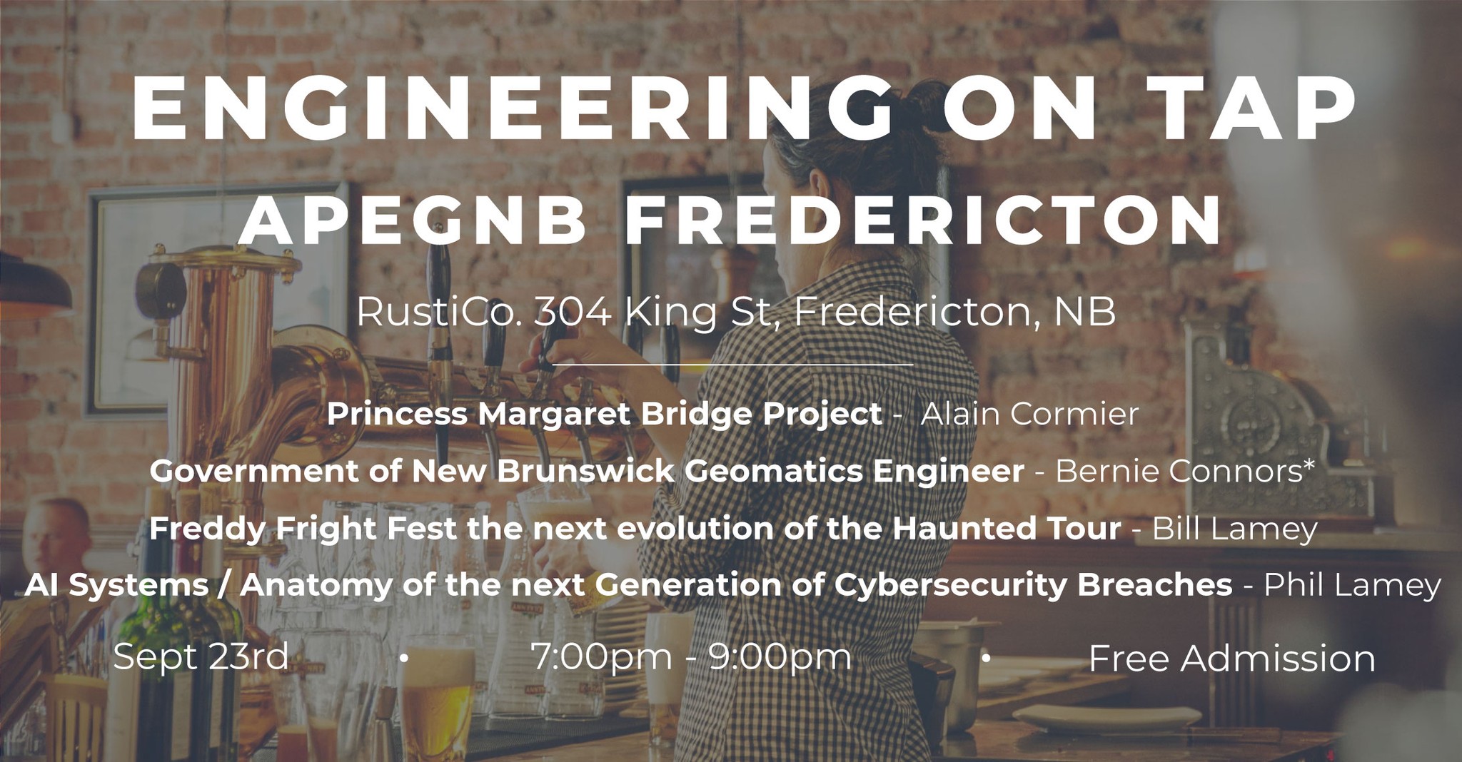 Join us for great presentations, conversations, social networking and some beverages.Oh, and let's not forget professional development hours opportunity. Presentations include: Alain Cormier - McAsphalt - Princess Margaret Bridge Project Bernie Connors* - Government of New Brunswick Geomatics Engineer Bill…